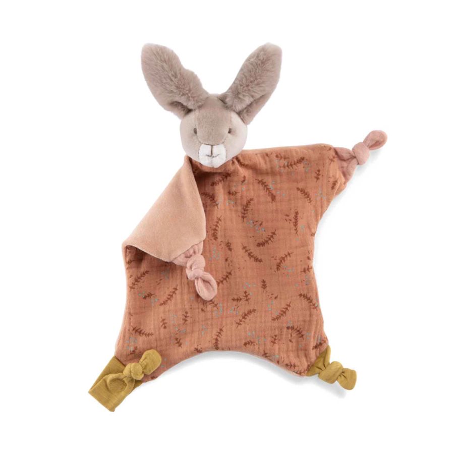 πανάκι αγκαλιάς μωρού  κουνελιού με κλιπ πιπίλας. Αναπαυτικός σύντροφος δύο υλικών με μεγάλα απαλά αυτιά, διακοσμημένα με ντελικάτα σχέδια στη μία πλευρά. Δεμένο με κόμπο  σε κάθε γωνία, είναι εύκολο να το πιάσουν τα μικρά χεράκια. Μπορεί να κεντηθεί με το μικρό όνομα του παιδιού.
