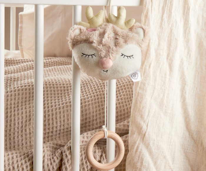 Περισσότερο από μία απλή βοήθεια για τον ύπνο του μωρού. Το ονειρεμένο ελαφάκι παίζει την υπέροχη μελωδία του “Wiegenlied” του Brahms, γνωστό και ως “Guten Abend, gut’ Nacht”. Είναι επιπλέον εξαιρετικά μαλακό και δεν είναι μόνο για να το ακούσετε, αλλά και για να το αγκαλιάσετε, να το πιάσετε και να το εξερευνήσετε με τα χεράκια σας. Το μωρό σας θα αγαπήσει το ελαφάκι με το διακριτικό σχέδιο. Θα βοηθήσει το μικρό σας να βρει ήρεμο ύπνο και να το νανουρίσει με όμορφα όνειρα. Η μουσική είναι εύκολη στη χρήση και αντλείται μέσω του ξύλινου δακτυλίου. Με τα πρακτικά κορδόνια, το Ella μπορεί να τοποθετηθεί εύκολα οπουδήποτε. Ένας γλυκός σύντροφος από τη γέννηση!